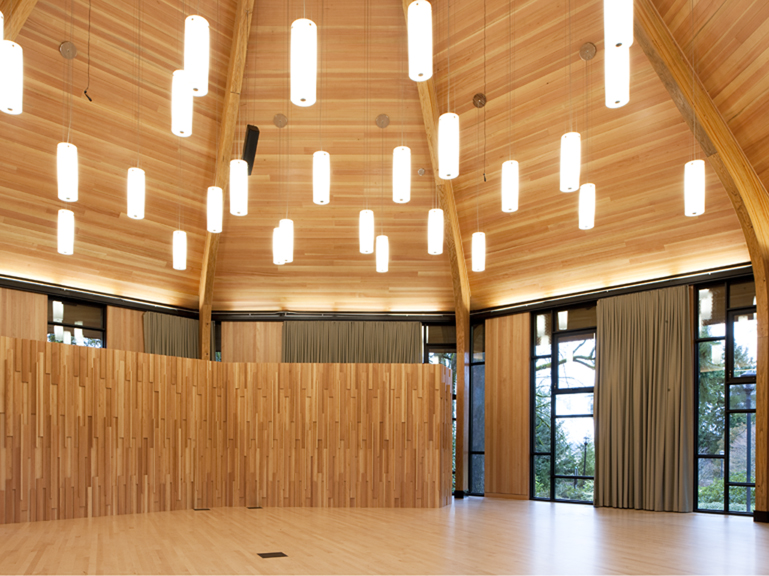 Much of the wood in Gregg Pavilion is Douglas Fir, which was milled from five trees that were located where the building now stands. The wood was used for the slat wall in the hallway and the figured screen wall in the middle of the room (which is designed to meet the acoustical needs of the room). A kitchenette enables food preparation for events.